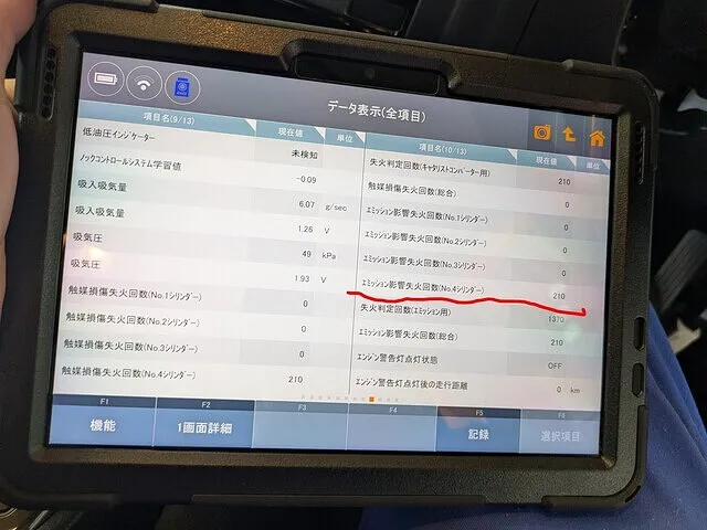 エンジンをかけながらデータを確認していくと、4番シリンダーのみ失火回数がどんどん増えていきます。