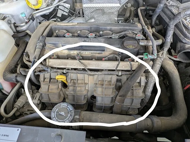 先程の白丸の部分、インテークマニホールドという部品を外した状態になります。